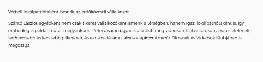 Az egymillió forintos pénzjutalommal járó elismerést egyébként a Budapesti Kereskedelmi és Iparkamara (BKIK) ipari tagozatának elnöke adta át. Az eseményen jelen volt Demján Sándorné, a nemrégiben elhunyt Demján Sándor özvegye is – fogalmazott lapunknak a kitüntetett erdőkövesdi vállalkozó.